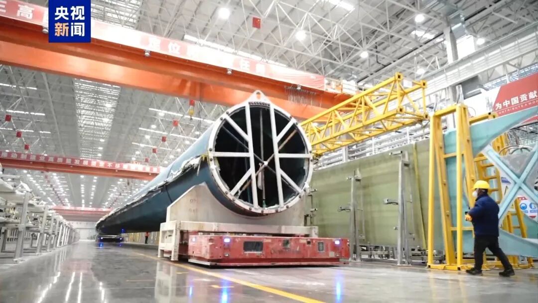 總臺(tái)央視記者 唐蕾:82米長的葉片真的太大太大了,相當(dāng)于150個(gè)成年人站成一排,它的重量有20多噸,你能夠想象嗎?這么大一個(gè)巨無霸竟然用了一天時(shí)間就完成了。
