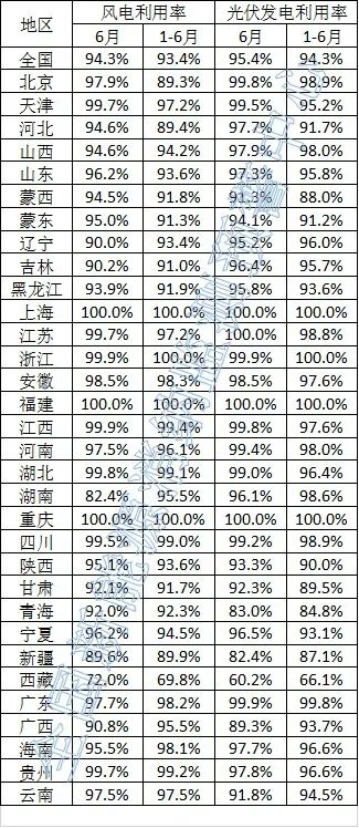 六月份全國風(fēng)電、光伏利用率分別為94.3%、93.4%。